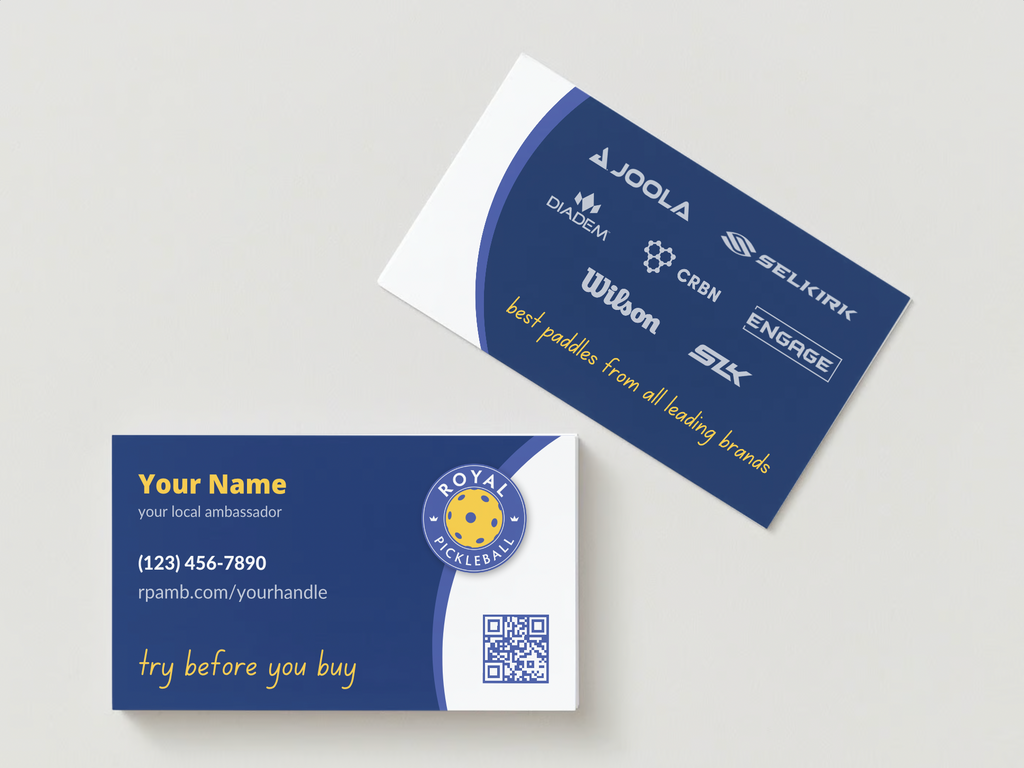 The basic premise is to provide local pickleball players (your clients) with the ability to "demo" the latest pickleball paddles, bags and gear. You can also give them advice and recommend which paddles and gear would fit their game style. You can purchase paddles available on the Royal Pickleball Online Store at up to 80% off retail price to use for demo purposes with your clients. Whenever you have a client interested in purchasing a product, you’ll send them to your ambassador profile (your Ambassador Business Card will help with that) where they can order the paddles, bags and gear and you will receive a commission.